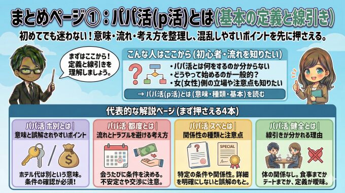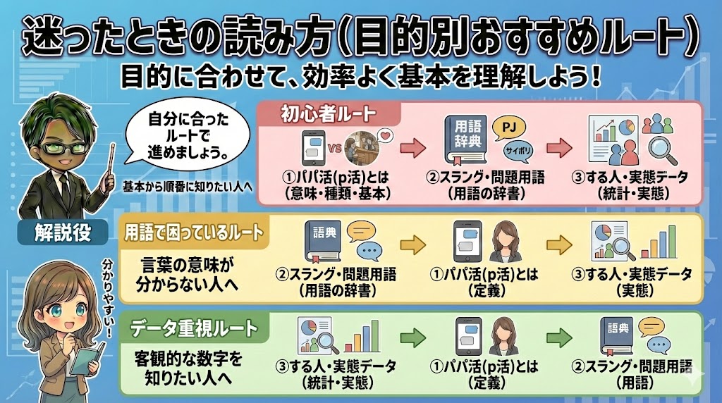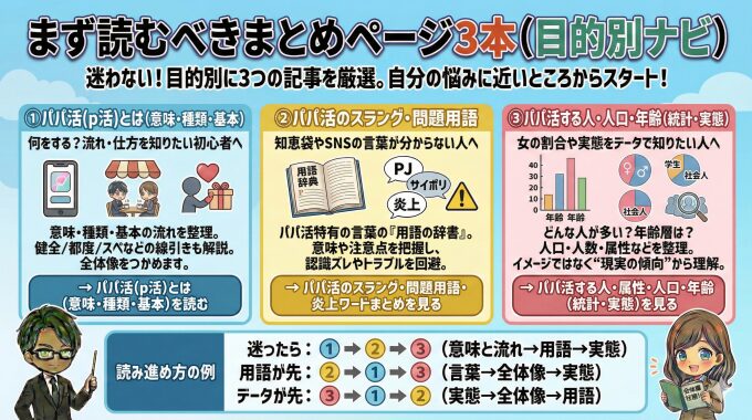 どのページから読めばよいか迷った場合は、目的に応じて以下の順番で読み進めると、パパ活の基本を効率よく理解できます。