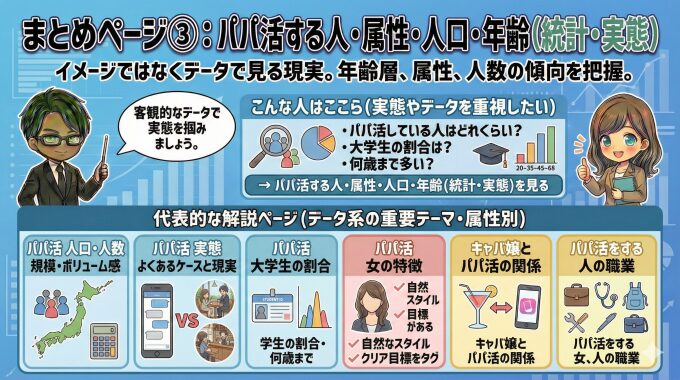「パパ活している人はどれくらいいるの?」「大学生の割合は?」「何歳まで多い?」といった疑問を持つ人は、まずこのまとめページで全体像を確認するのがおすすめです。