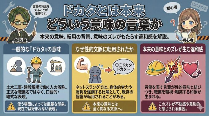 「膣ドカタ」という言葉の問題性を理解するには、「ドカタ」という語が本来どのような意味で使われてきたのかを整理する必要があります。言葉の元の意味と、現在のネット上での使われ方には大きなズレがあり、そのギャップが強い違和感や反発を生んでいます。