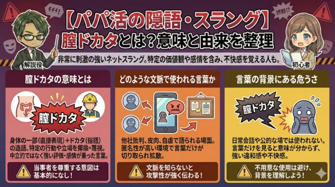 パパ活で使われるスラングや問題用語を体系的に確認したい方は、パパ活のスラング・問題用語まとめをご覧ください。