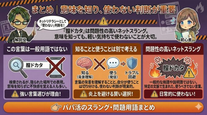 ネットリテラシーとして言葉の背景を理解することと、自分がその言葉を使うことは切り分けて考える必要があります。意味を知ったうえで「使わない」と判断することが、不要なトラブルや炎上を避ける最も現実的な選択です。