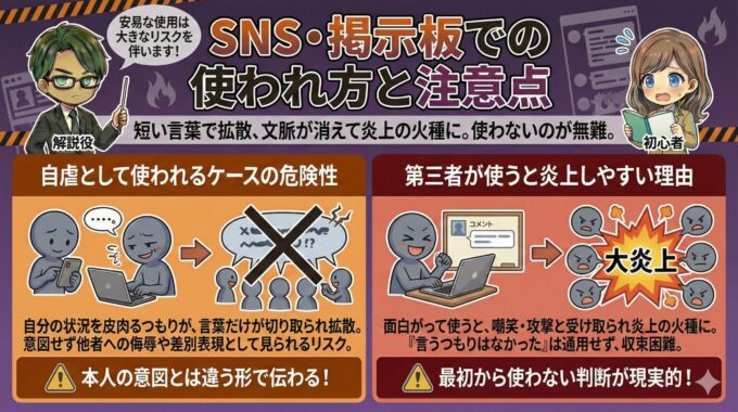 自虐として使われるケースがある一方で、第三者が面白がって拡散すると、攻撃や嘲笑として受け止められやすくなります。特に、文脈を知らない人の目に触れる場では、言い訳が効かず一気に炎上へ進むことがあります。