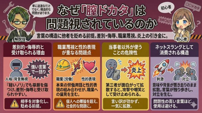 膣ドカタが問題視される最大の理由は、単に言葉が過激だからではありません。言葉の構造そのものに、他者を貶める前提が組み込まれている点が大きいです。身体を直接指す表現を用いることで相手を一気に“対象化”し、さらに「ドカタ」という俗語を重ねることで、職業や労働を軽んじるニュアンスまで乗ってしまいます。SNSでは冗談や自虐のつもりで使われることもありますが、受け取る側からすると侮辱や差別表現に見えやすく、炎上の引き金になります。ここでは、どこが問題なのかを要素ごとに分解して整理します。