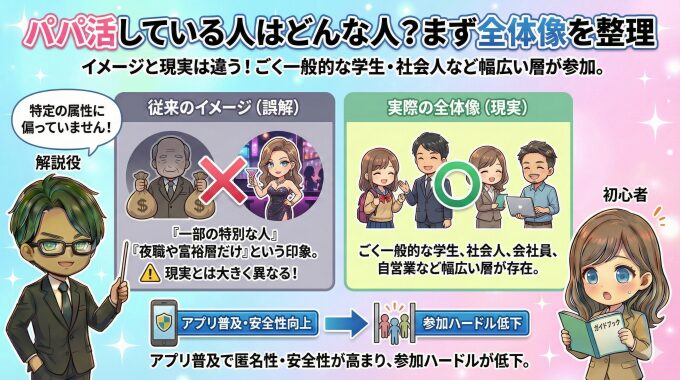 パパ活と聞くと、「一部の特別な人がやっている」「夜職や富裕層だけの世界」というイメージを持たれがちです。しかし、実際の利用データやアプリ登録者の傾向を見ると、その印象は現実とは大きく異なります。現在のパパ活は、特定の属性に偏ったものではなく、ごく一般的な学生や社会人が一定数参加している活動へと変化しています。