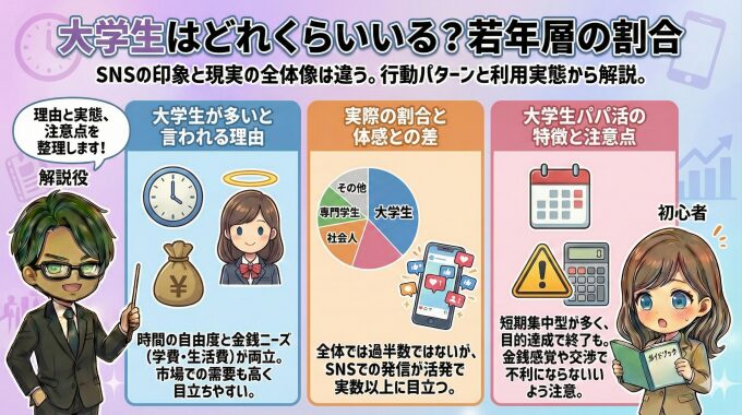 👉 大学生の具体的な割合や学年別の傾向については、パパ活 大学生 割合 で詳しく解説しています。