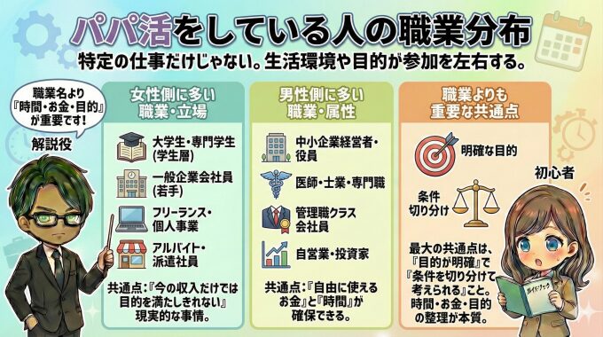 👉 職業別の詳しい傾向や具体例は、パパ活 職業 の解説ページで詳しくまとめています。