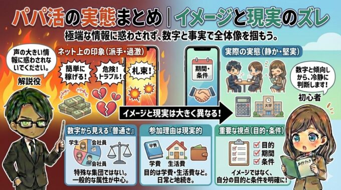 ここまで見てきたように、パパ活の実態はネット上で語られているイメージとは大きく異なります。極端な成功談や失敗談が目立つ一方で、実際に多いのは「期間・条件を決めて静かに関わる人たち」です。声の大きい情報ほど現実を歪めやすく、全体像を把握するには数字と行動パターンを見る必要があります。