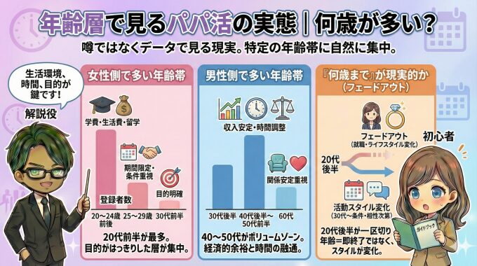 このページでは、感覚論や噂話ではなく、公開データ・利用者傾向・実際の活動パターンをもとに、パパ活をしている人の年齢層・職業・男女別の特徴を具体的に整理します。大学生の割合や「何歳まで多いのか」といった疑問にも、数字と実態ベースで答えていきます。