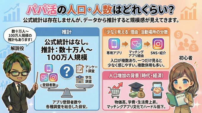 パパ活の人口については、国や自治体が集計している公式統計は存在しません。そのため「正確な人数」を断定することはできませんが、複数の公開データや民間調査を組み合わせることで、実態に近い規模感を把握することは可能です。