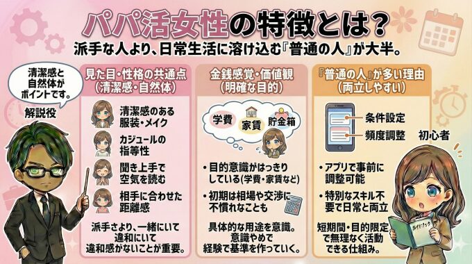 👉 女性側の傾向をさらに細かく知りたい方は、パパ活 女 特徴 で詳しく解説しています。