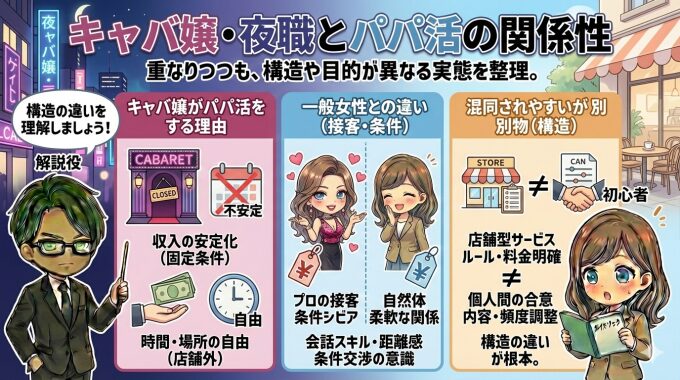 この章では、キャバ嬢がパパ活を選ぶ理由、一般女性との違い、そして混同されやすいが本質的に異なるポイントを整理します。