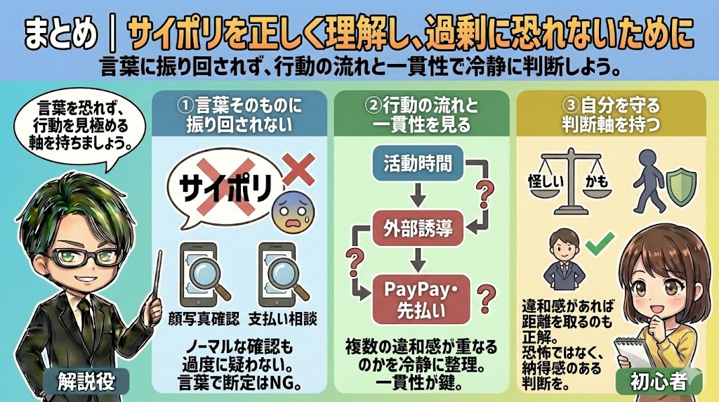 「怪しいかも」と感じた時点で距離を取る選択は間違いではありません。基準を知っていれば、恐怖ではなく納得感のある判断ができます。サイポリ対策とは、相手を疑い続けることではなく、自分を守る判断軸を持つことです。