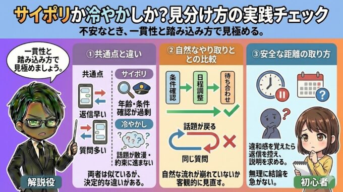 やり取りを続ける中で不安を感じたとき、「サイポリなのか、それとも冷やかしなのか」で迷う人は多いはずです。両者は似た行動を取ることもありますが、決定的な違いは“一貫性”と“踏み込み方”にあります。ここでは実際のメッセージ段階で使える見分け方を整理します。