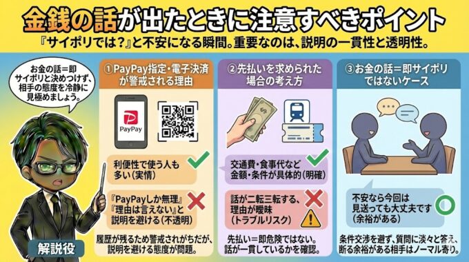 ノーマルなパパ活でも金額や支払い方法の相談は避けられません。ここでは、警戒すべきケースと過剰反応しなくてよいケースを分けて整理します。