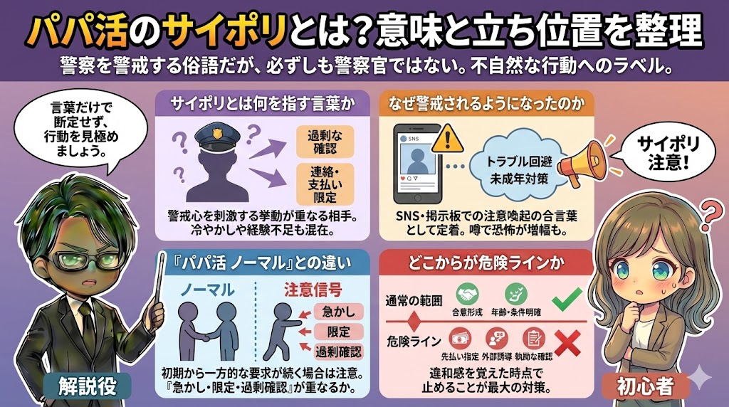 ここでは「パパ活 サイポリとは何か」を定義し、なぜ警戒語として定着したのか、そしてどこからがパパ活で、どこからが危険ラインなのかを整理します。判断軸を先に持つことで、顔写真要求や外部連絡先への誘導が出ても冷静に対応できます。