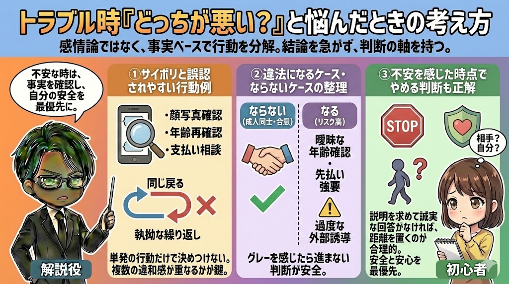 成人同士で、条件が合意され、強制や欺瞞がなければ違法性が直ちに生じるわけではありません。一方で、年齢確認が曖昧、金銭の先払いを強要される、外部連絡先へ過度に誘導される場合はリスクが高まります。グレーを感じたら進まない判断が安全です。