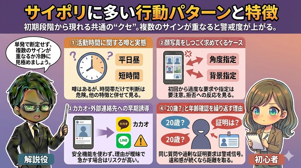 サイポリと疑われる相手には、やり取りの初期段階から共通した“クセ”が現れやすいのが特徴です。単発の行動だけで断定する必要はありませんが、複数のサインが同時に重なると警戒度は上がります。ここでは噂として広まりやすいポイントと、実際のやり取りで確認しやすい具体像を整理します。