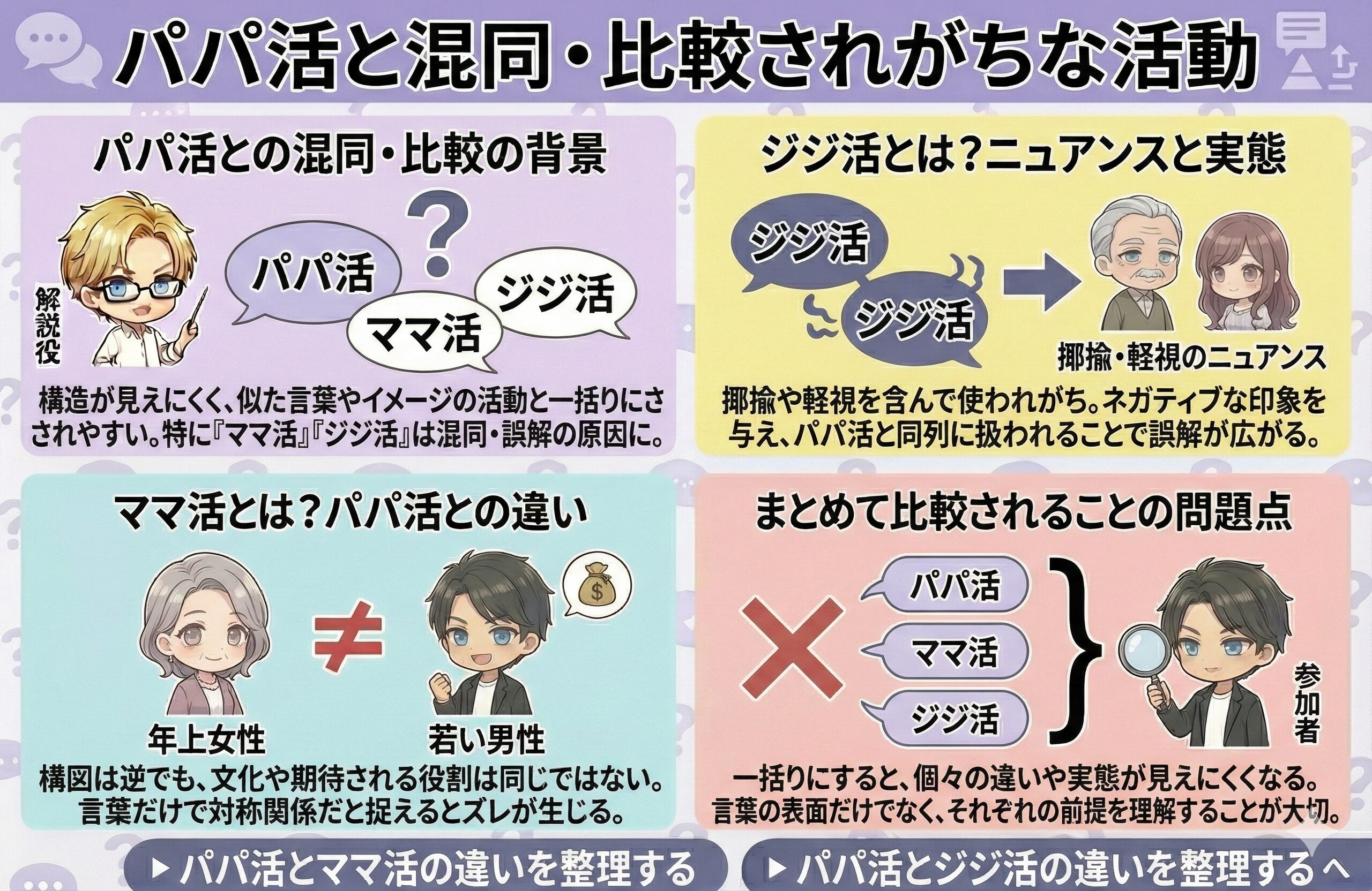 パパ活は、その構造が外から見えにくいこともあり、似た言葉やイメージを持つ活動と一括りにされやすい傾向があります。特に「ママ活」「ジジ活」といった言葉は、パパ活と並べて語られることが多く、混同や誤解の原因になりがちです。