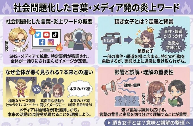 パパ活に関連する言葉の中には、SNSやニュース、動画メディアをきっかけに一気に拡散し、社会問題として扱われるようになったものもあります。こうした言葉は、特定の事例や人物像が強調されることで、本来とは異なるイメージを定着させてしまう傾向があります。