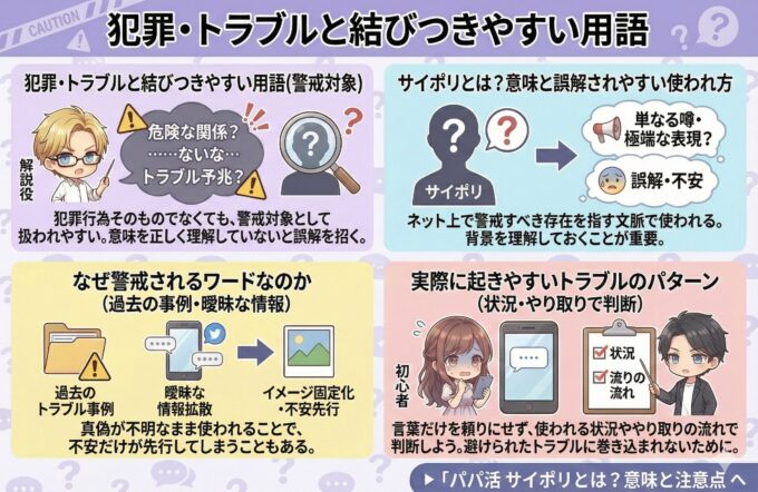 パパ活に関連する言葉の中には、意味を正しく理解していないと「危険な関係」や「トラブルの予兆」と受け取られてしまうものもあります。これらの用語は、犯罪行為そのものを指すわけではなくても、警戒対象として扱われやすい点に注意が必要です。
