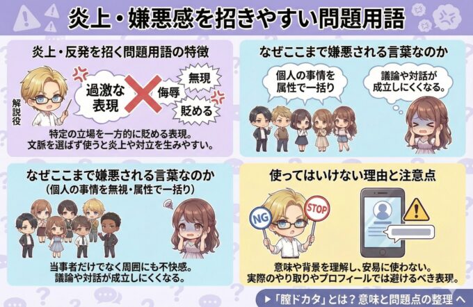 パパ活に関連する言葉の中には、意味以前に「使われるだけで強い反発を招く表現」も存在します。こうした言葉は、特定の立場や価値観を一方的に貶めるニュアンスを含むことが多く、文脈を選ばずに使われることで炎上や対立を生みやすいのが特徴です。