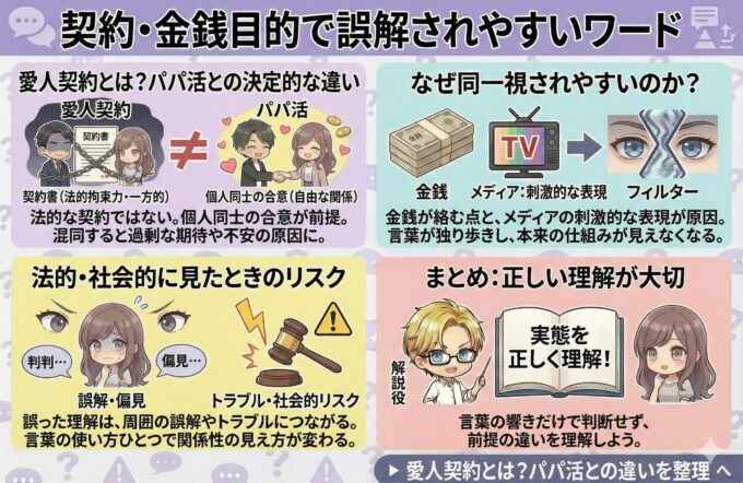 愛人契約という言葉は、継続的な関係や経済的な支援を強く連想させますが、パパ活では個人同士の合意が前提であり、法的な契約を結ぶものではありません。この違いを理解していないと、過剰な期待や不安を生むことになります。