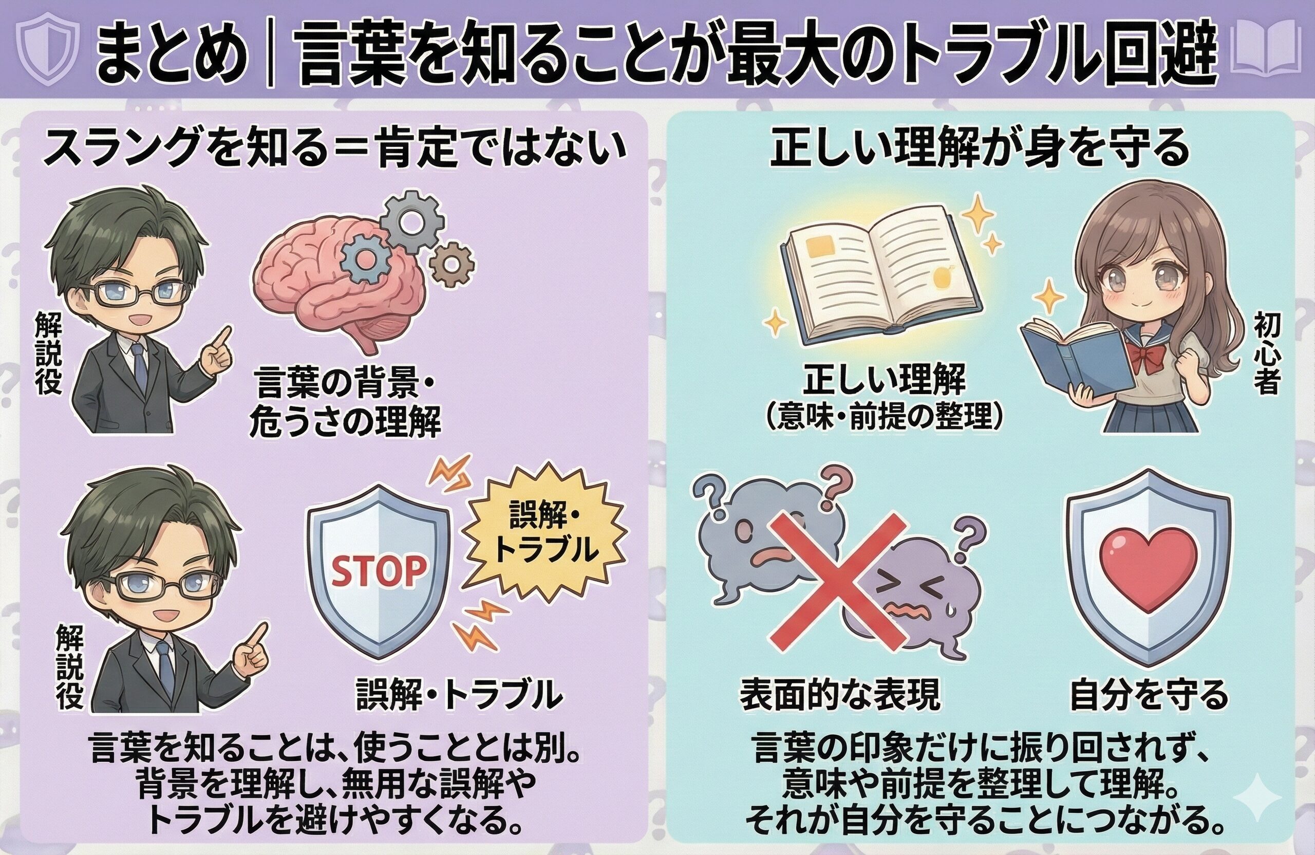 スラングや問題用語を知ることは、それを肯定したり使うこととは別です。むしろ、言葉の背景や危うさを理解することで、無用な誤解やトラブルを避けやすくなります。