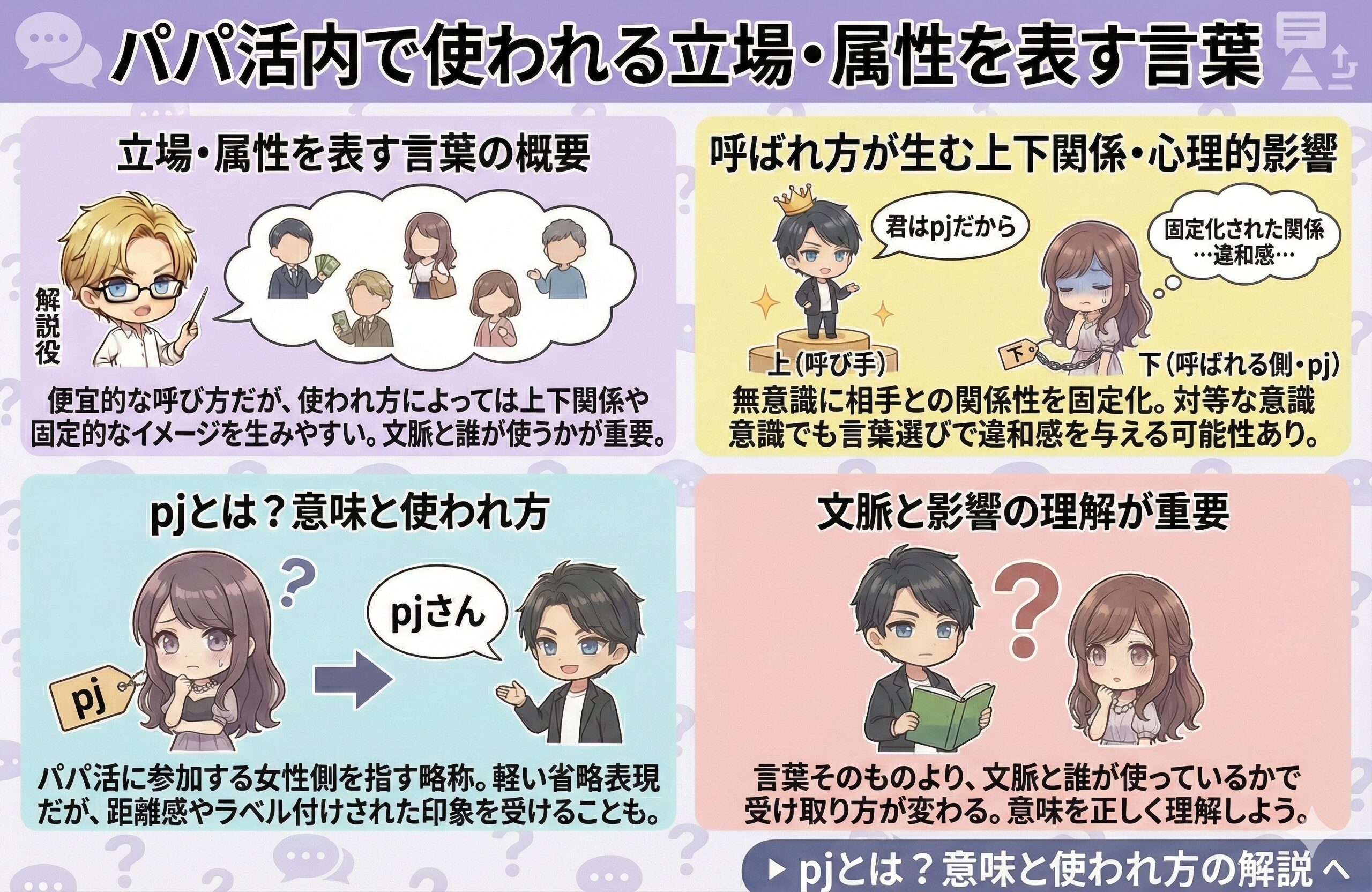 パパ活のやり取りの中では、参加者の立場や役割を簡略的に表す言葉が使われることがあります。これらは便宜的な呼び方である一方、使われ方によっては上下関係や固定的なイメージを生みやすい点に注意が必要です。