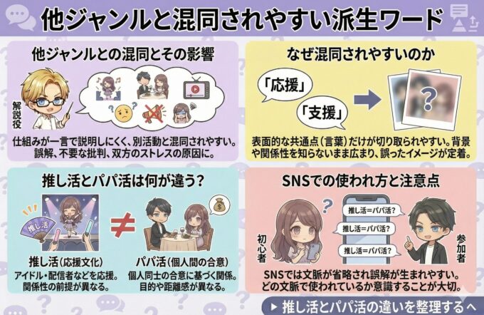 推し活とパパ活の違いや、混同されやすいポイントについては、以下のページで詳しく解説しています。