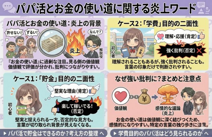 パパ活においては、「お金を何に使っているのか」という点が過剰に注目されやすく、それが炎上や批判につながることがあります。特に「貯金」や「学費」といった目的は、見る側の価値観によって評価が大きく分かれやすいテーマです。