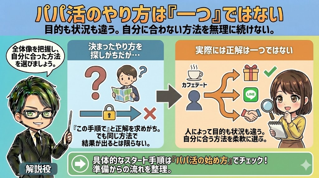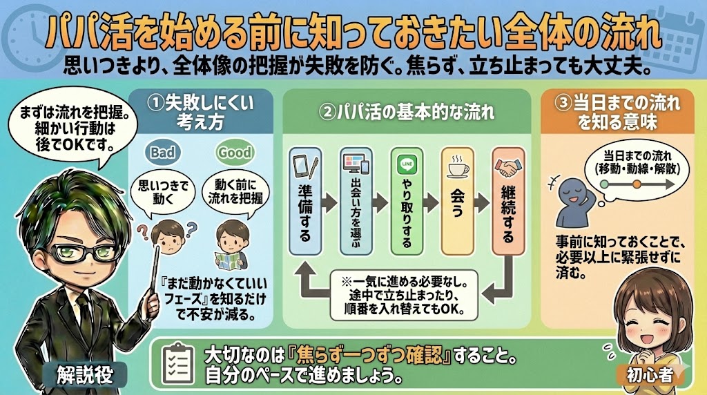 具体的なスタート手順を知りたい人は、パパ活の始め方で、準備段階からの流れを整理しておくと安心です。