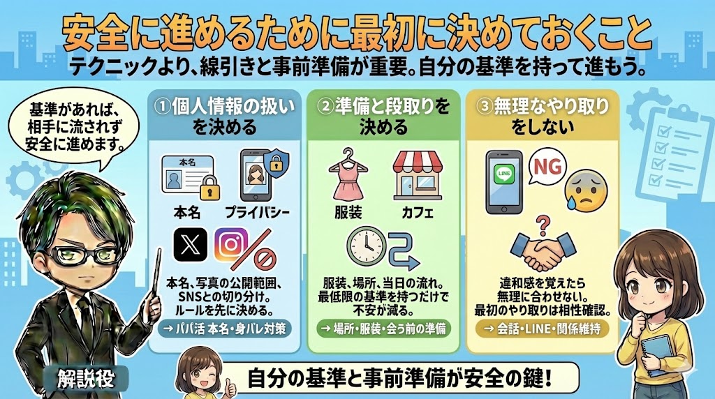 パパ活を長く安定して続けるためには、行動する前に「自分の基準」を決めておくことが欠かせません。準備不足のまま進むと、相手に流されやすくなり、後から違和感や不安が積み重なります。安全に進めるためのポイントは、テクニックではなく、線引きと事前準備にあります。