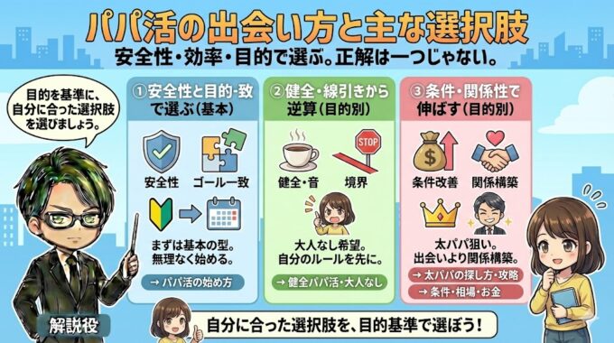 パパ活のやり方で迷う一番の原因は、「どこで出会うか」を先に決められないことです。出会い方には複数の選択肢があり、安全性・効率・相手の層がそれぞれ違います。正解は一つではないので、まずは特徴を知り、自分が優先したいもの(安全・健全・条件・継続)を基準に選ぶのが失敗しにくい進め方です。