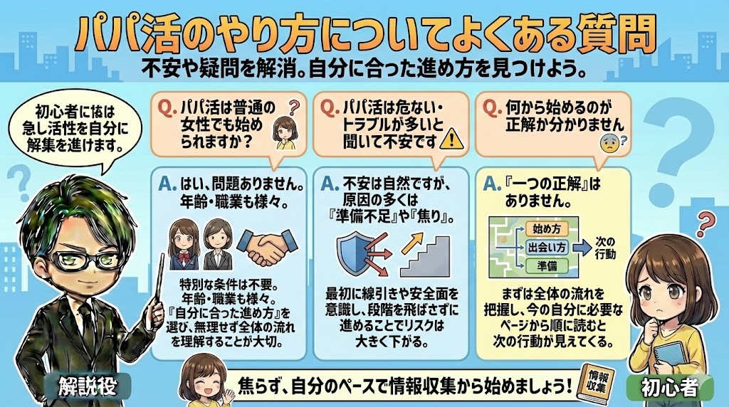 初心者が感じやすい不安や考え方の整理については、パパ活 初心者や、気持ちの持ち方をまとめたパパ活 メンタルも参考にしてください。
