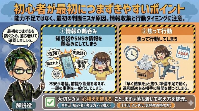 パパ活がうまくいかないと感じる初心者の多くは、能力や向き不向きの問題ではなく、最初の判断でつまずいています。特に、情報の集め方や行動のタイミングを誤ると、不安が増えたり、無駄に疲れてしまう原因になります。ここでは、よくあるつまずきポイントを整理します。